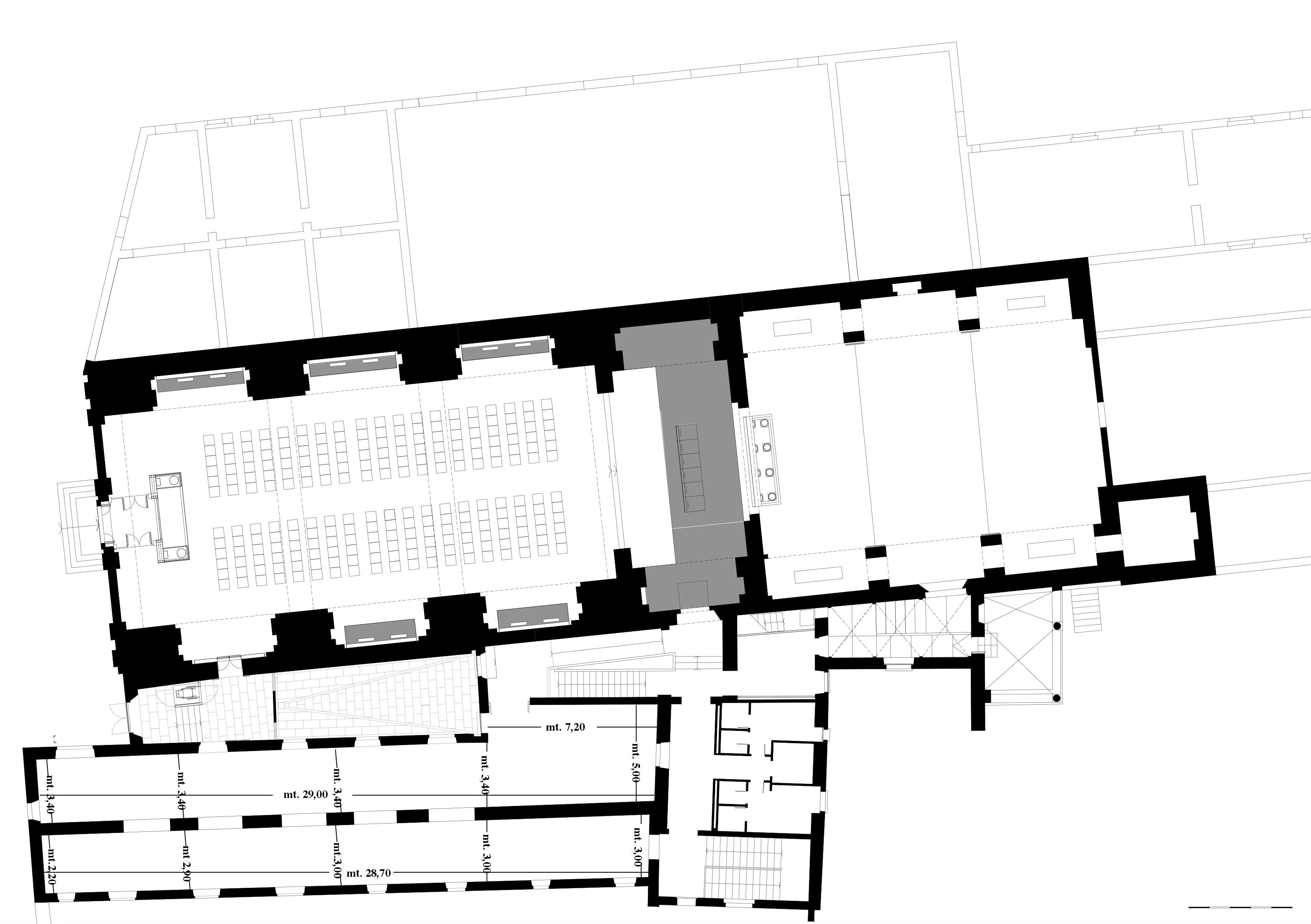 Grazie all’ambientazione suggestiva, nell’ampia navata centrale, la Sala consente una qualificata forma di ospitalità in un contesto di assoluto prestigio. Lo scenario unico è amplificato dalla vicinanza con il superbo Coro delle monache, affrescato dal Ferramola e da Paolo da Caylina, che in un gioco di fessure e prospettive si può scorgere agevolmente dalla platea.